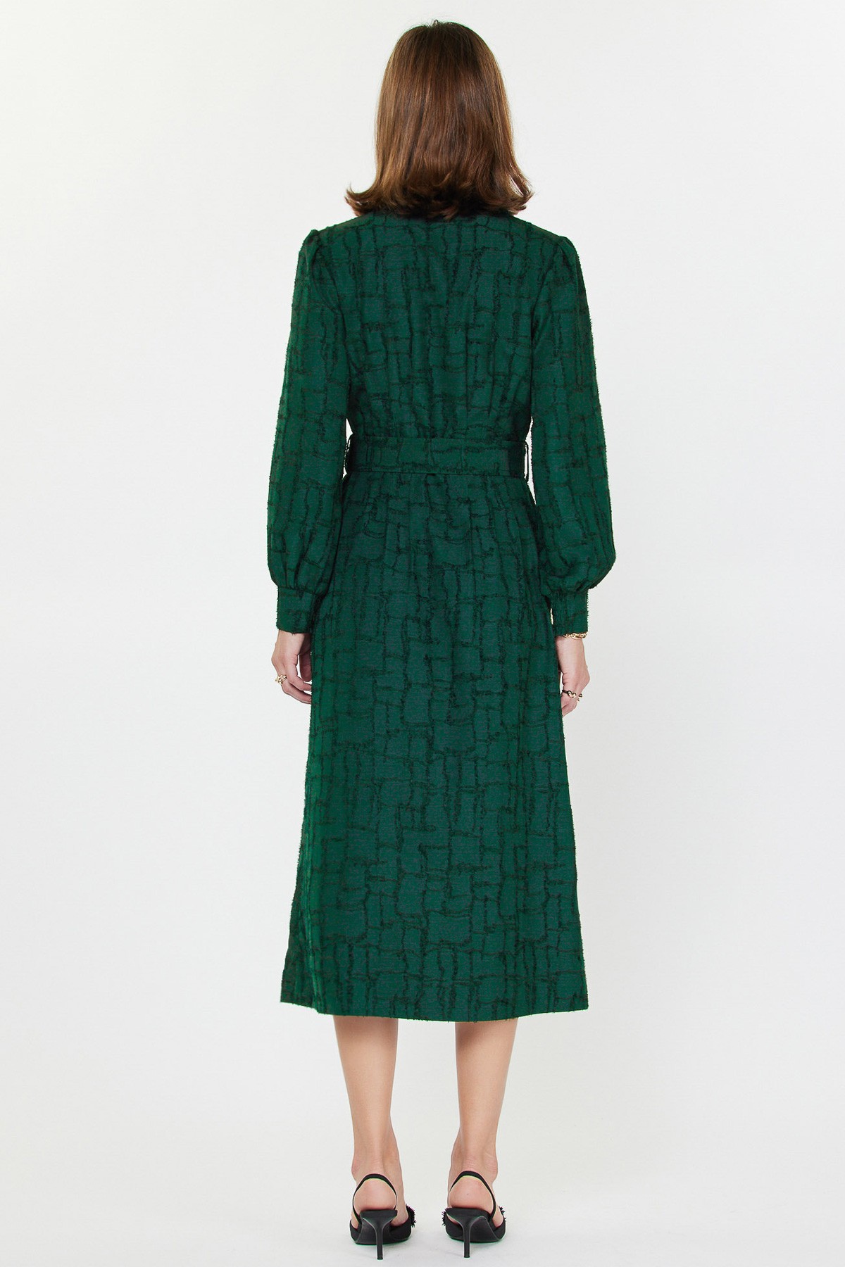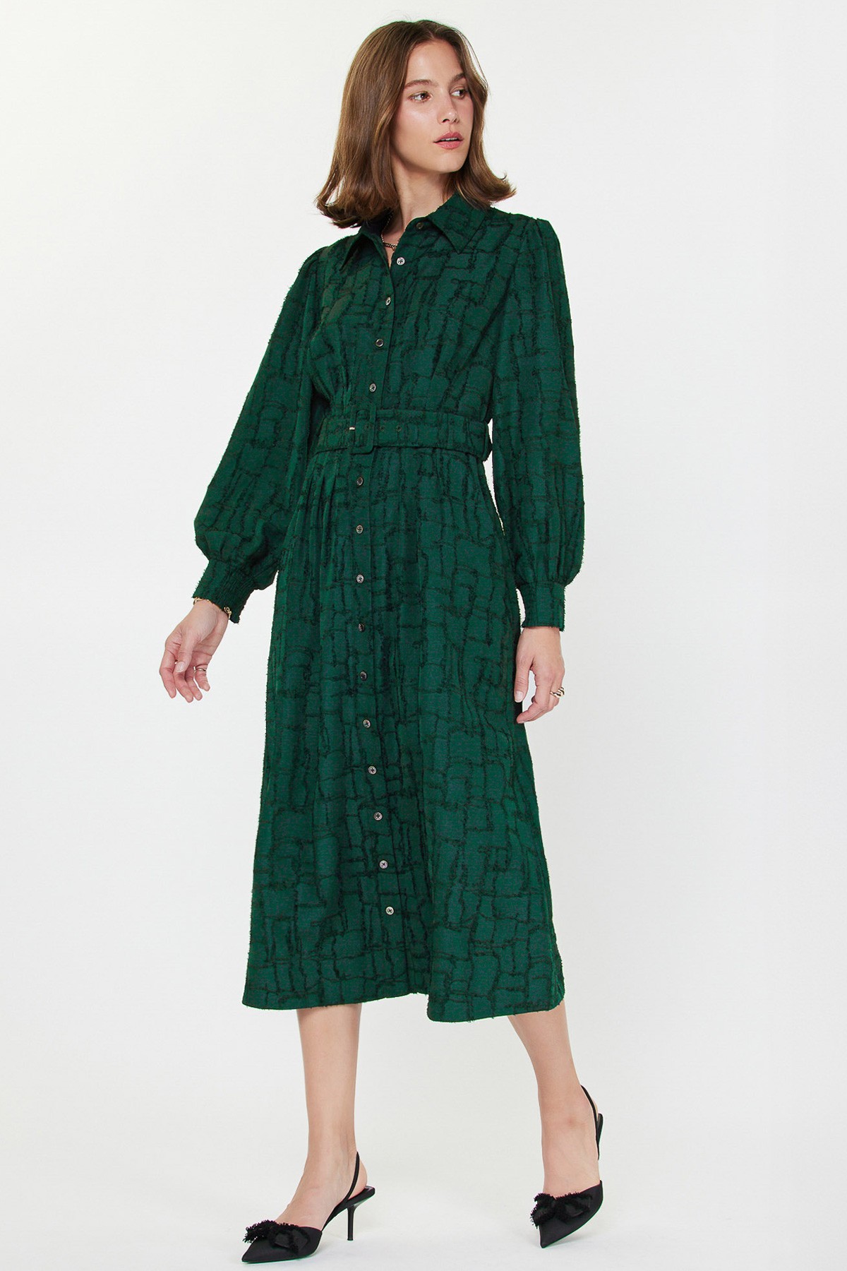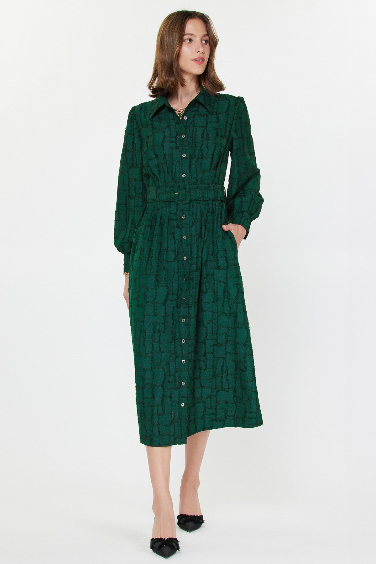 Textured emerald green shirt dress with self belt