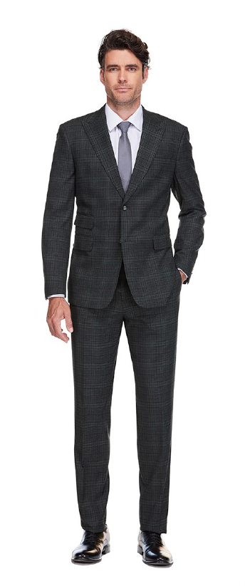 Olive with green plaid suit Two button, side vents Ticket pocket Fully lined Year round fabric